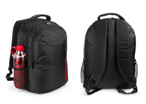 Morral con cargaderas ajustables y acolchadas, bolsillo principal con compartimiento apropiado para portátil de 14". Bolsillo medio con compartimiento para documentos, celular y bolígrafos, bolsillo frontal con cremallera lateral y bolsillos laterales en malla.