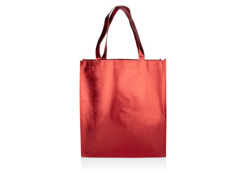 Bolsa tipo tote fabricada en material metalizado brillante. Su acabado reflectivo le da un aspecto moderno y atractivo. Cuenta con asas para facilitar su transporte y un diseño espacioso que permite múltiples usos.