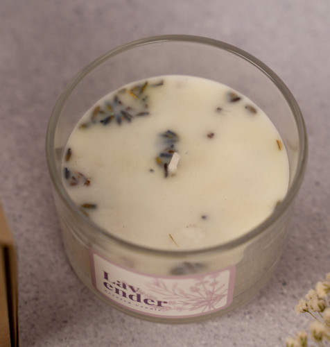 Vela Premium de Soya: Elaborada con cera vegetal y decorada con pétalos naturales, diseñada para una quema limpia y aromática.