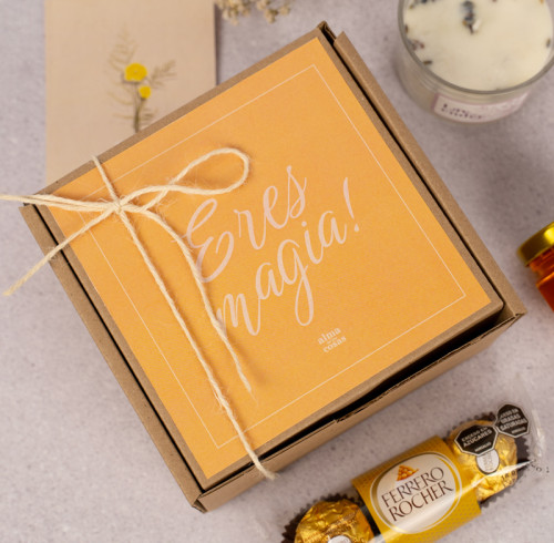 Caja de Autor: Empaque de cartón kraft con tapa personalizada según tu branding y un elegante amarre en hilo natural.