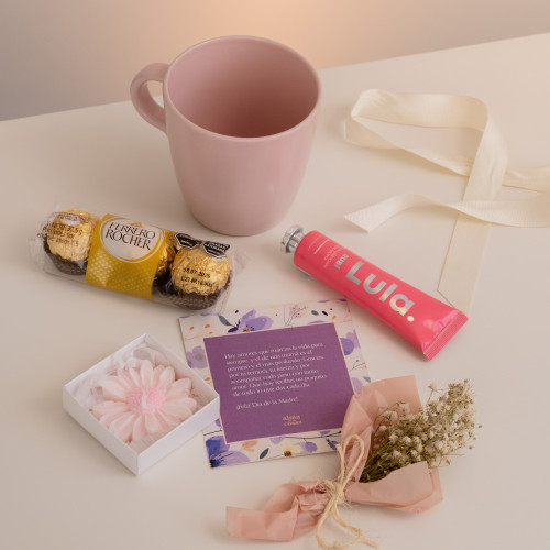 Consiente a tus colaboradoras en su día con un detalle lleno de amor, pensado para hacerlas sonreír y recordarle lo especial que son para la empresa. Este hermoso kit incluye Ferrero x3, un mug cerámico, crema hidratante de manos, una vela artesanal en forma de flor y un delicado bouquet de flores secas, creando una experiencia dulce y llena de encanto.