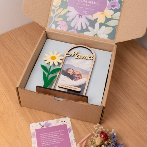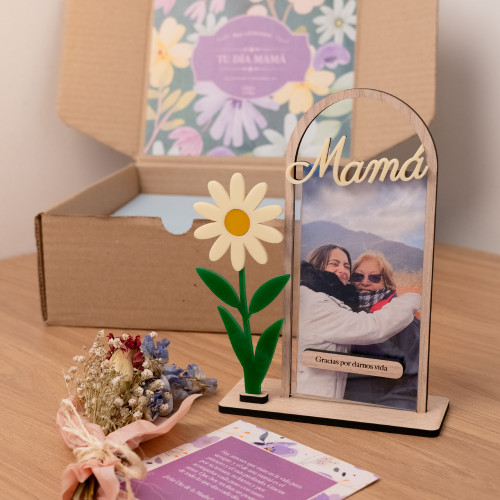 Un regalo cercano y lleno de significado para mamá. Este kit incluye un marco de madera en forma de arco, personalizable con su foto favorita y grabado con el mensaje “Mamá” y “Gracias por darnos vida”, acompañado de un delicado ramito de flores secas y una flor decorativa en acrílico. Incluye una postal con mensaje alusivo al Día de la Madre y viene en empaque de regalo, listo para sorprenderla y emocionarla.